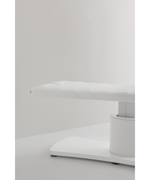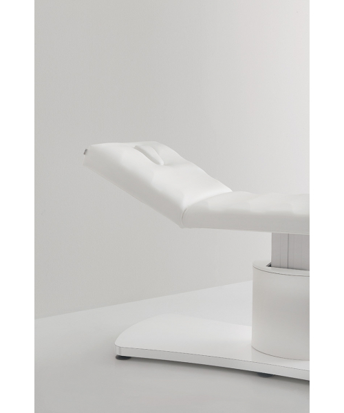 Массажная кушетка «E-motion» – это сочетание эргономики и ультрастильного дизайна. Основание выполнено из хромированной стали, обивка кушетки – из матового заменителя кожи белого цвета. Регулировка по высоте осуществляется посредством электрического подъемника. Для настройки параметров используется ножная педаль. Матрас оснащен разъема для лица, за счет чего клиент не ощущает дискомфорта, лежа на животе во время процедур. Производитель предусмотрел возможность изменения угла наклона спинки на 0°, 15°, 30°, 45°. Также кушетка оснащена держателем для бумажных салфеток в рулоне.